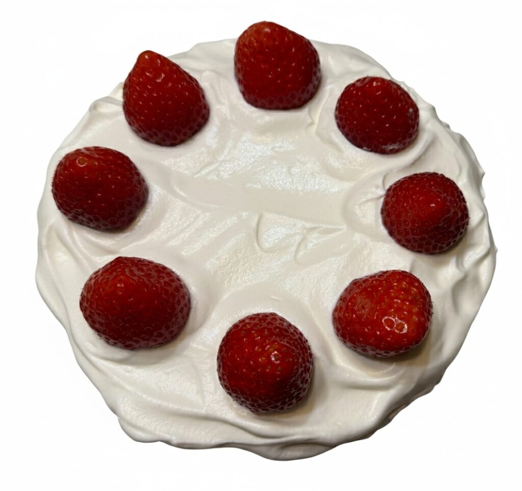 1個まるごと使う苺:端のギリギリより手前に配置すると、分けた後に倒れにくくなります。バラバラにトップに配置するより、円に沿って均等に配置することで、カットしやすくなります。